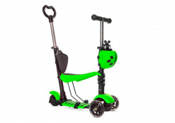 Детский трехколесный самокат со светящимися колесами размером 120/80 мм. Материал: алюминий и пластик. Регулируемый по высоте руль: 65-75 cм. Самокат дополнен переставным по высоте сидением, спинкой, корзинкой на руле и ручкой-толкателем.